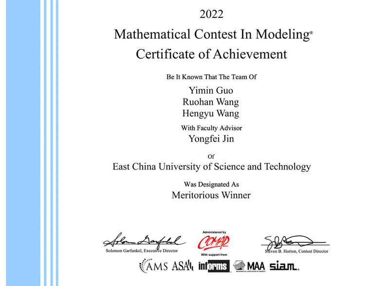 靳勇飞老师指导的信息学院2019级本科生郭懿敏、王若菡、中德工学院王恒煜团队获得一等奖(Meritorious Winner)。此外,国产成人