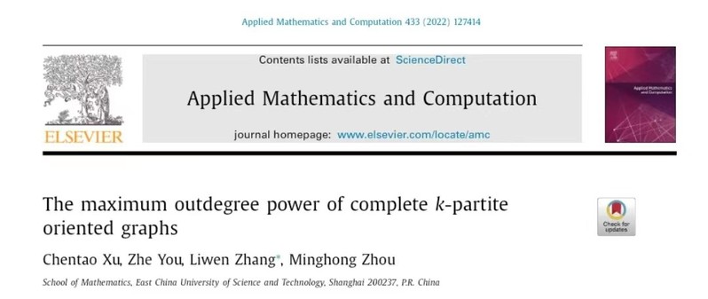 2019级本科生许晨涛、游哲、周明弘和2019级研究生张力文在国际知名期刊APPLIED MATHEMATICS AND COMPUTATION(该期刊连续四年在JCR SCI分区中位列MATHEMATICS, APPLIED - SCIE(Q1),影响因子为4.397)发表了题为The maximum outdegree power of complete k-partite oriented graphs的研究成果。指导老师为林辉球教授。